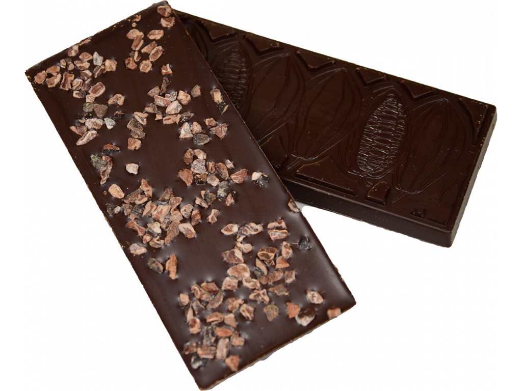 Čokoládová tabulka ze 70,5% hořké čokolády doplněná kakaovými boby nebo klikvou.