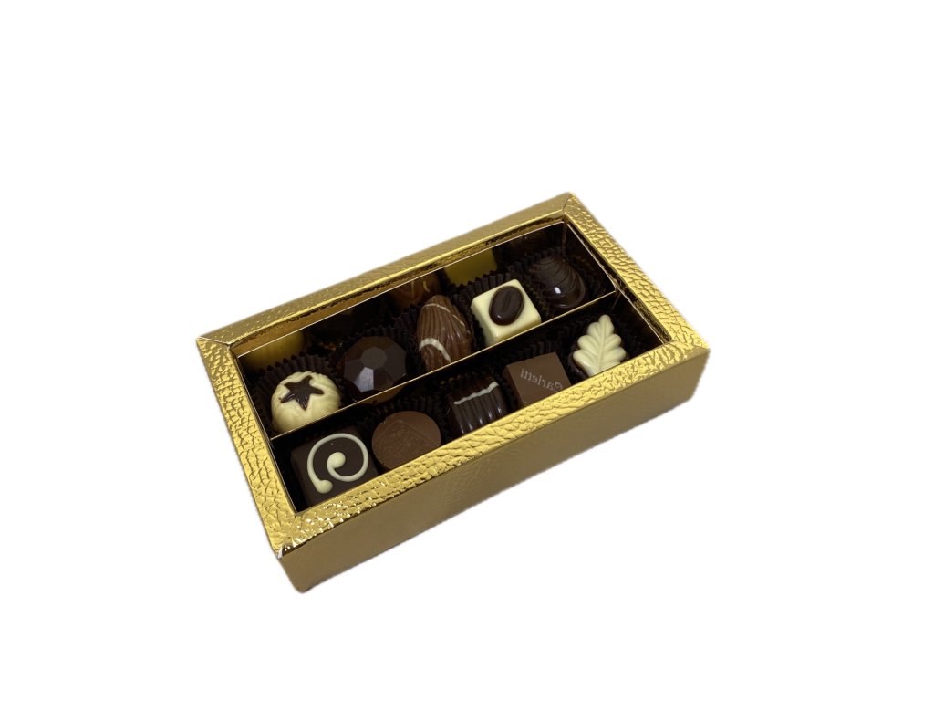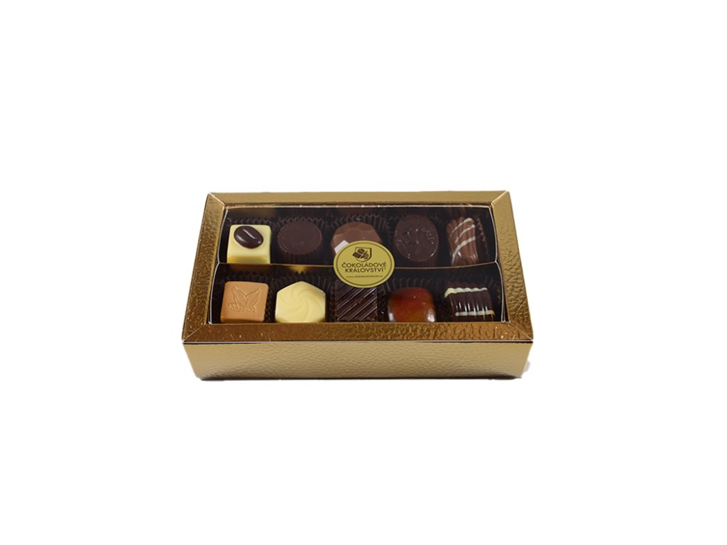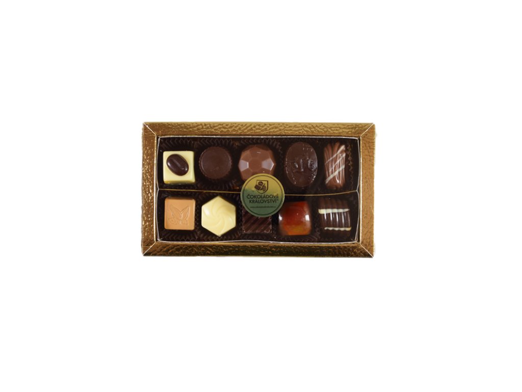 10 jedinečných kousků čokoládových pralinek v papírové krabičce s průhledným plastovým návlekem.