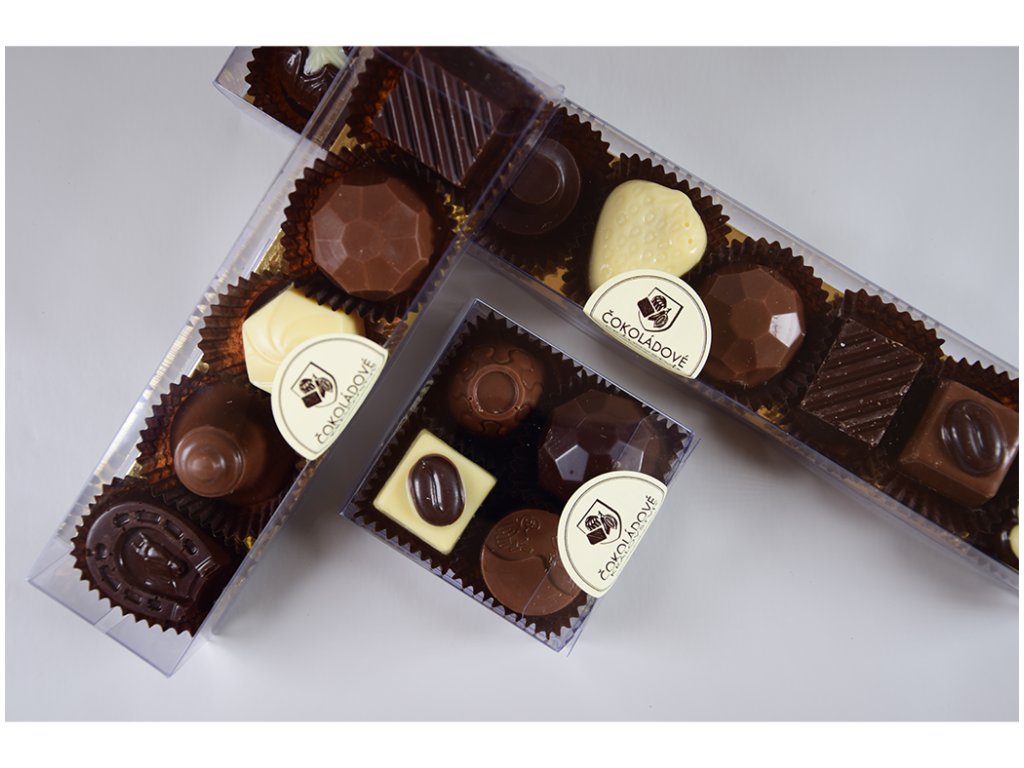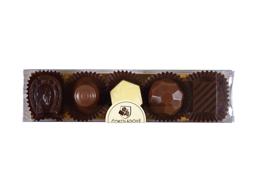 5 jedinečných kousků čokoládových pralinek v průhledné plastové krabičce.
